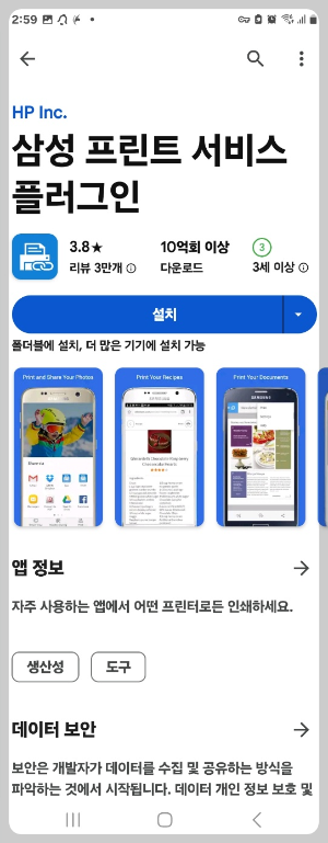 구글 플레이 스토어에 들어갑니다. 삼성 모바일 프린트와 삼성 프린트 서비스 플러그인을 검색해서 설치해 줍니다.