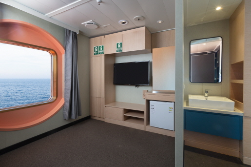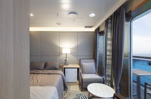 객실내 테라스를 갖춘 2인용 특등실 룸구성: 퀸침대 1개, 티테이블, 쇼파, 테라스, 욕실 편의시설 및 용품: TV, 냉장고, 에어컨, 옷장, 옷걸이, 타올, 어메니티, 구명조끼 |
