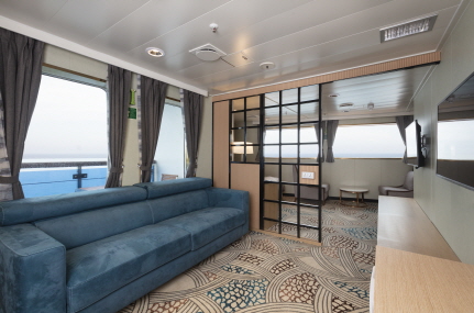 객실내 테라스를 갖춘 2인용 특등실 룸구성: 퀸침대 1개, 티테이블, 쇼파, 테라스, 욕실 편의시설 및 용품: TV, 냉장고, 에어컨, 옷장, 옷걸이, 타올, 어메니티, 구명조끼 |