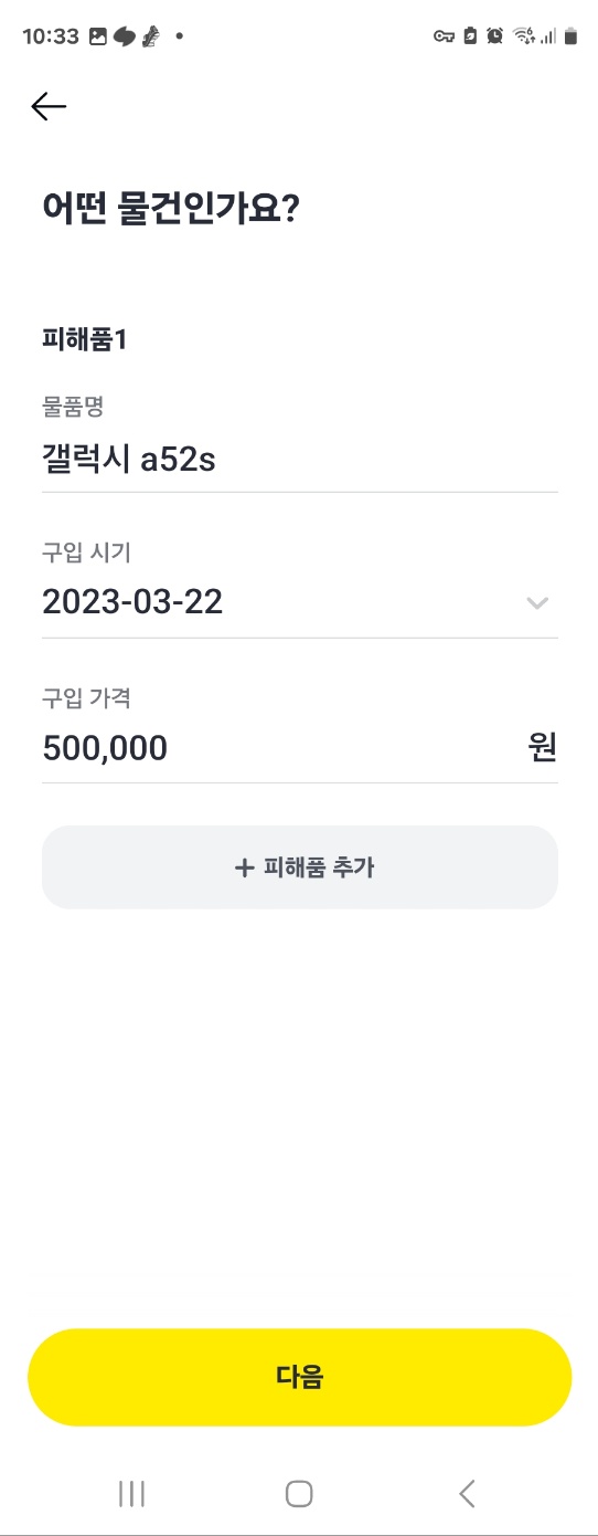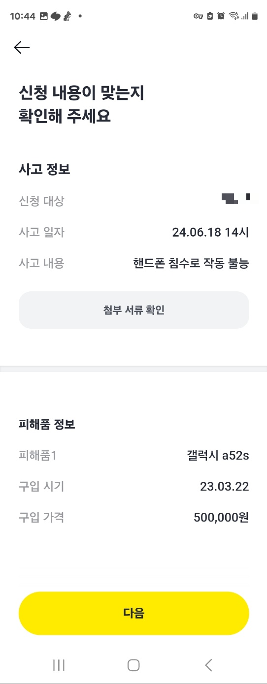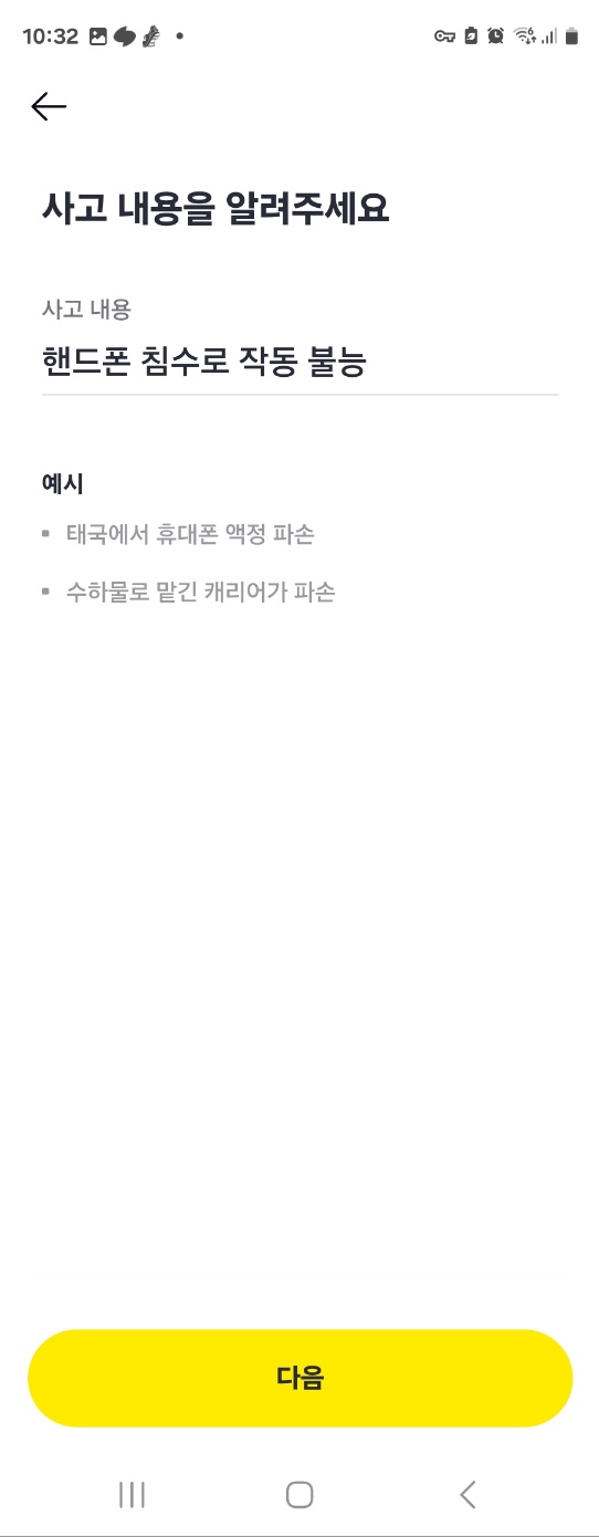 다음에는 사고 내용을 입력하게 됩니다. 사고 일시, 사고 내용, 사고 물품 정보를 입력하는데 사실 딸 핸드폰을 언제 구입했는지 기억도 안 나고, 가격은 통신사 이동 특가로 지원금 받으면서 핸드폰을 받은 경우라 대충 적었어요.