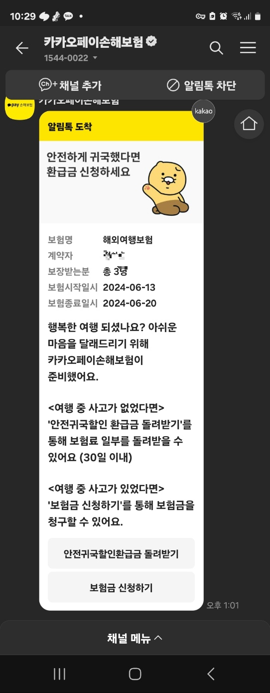 카카오페이 여행자보험을 가입하고 여행을 다녀오면 아래와 같이 카카오톡으로 메시지가 옵니다. 저 메시지를 통해서 보험금 신청에 필요한 서류도 확인할 수 있고, 보험금 신청도 바로 할 수 있어서 편리한 것 같아요. 여행 중 사고가 없었다면 보험료의 10%를 환급받을 수 있는데 저는 두 번 다 사고가 있어서 환급은 안되네요. 그럼 보험금을 신청한 과정을 정리해 볼게요.