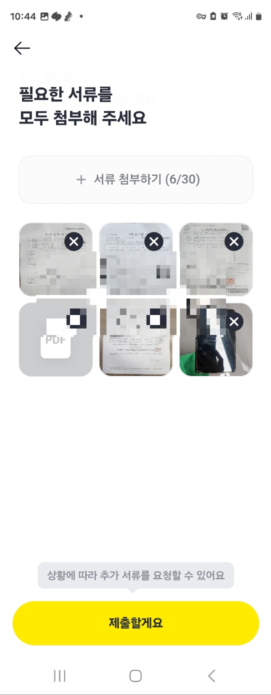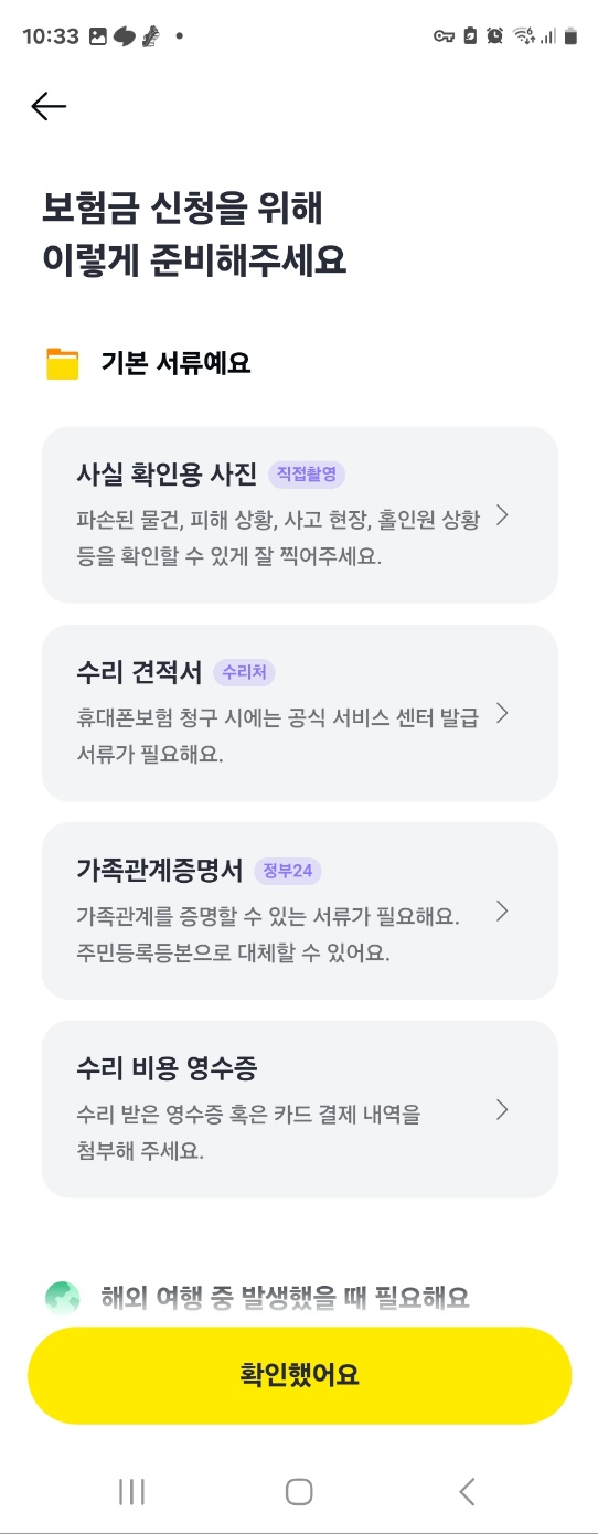다음은 필요한 서류를 첨부하는 단계입니다. 첨부 전에 필요한 서류를 친절하게 알려줍니다. 핸드폰 수리의 경우 파손된 핸드폰 사진, 서비스센터에서 받은 수리 견적서와 수리 비용 영수증, 미성년자녀의 보험금을 대신 신청하는 것이라서 그런지 가족관계증명서, 출입국 사실 증명서, 통신사 가입 사실 확인서, 통신사 부가서비스 내역서가 필요했습니다. 그런데 통신사에 문의한 결과 통신사 부가서비스 내역서라는 서류는 따로 없다고 해서 저는 통신사 가입 사실 확인서만 받아서 첨부하였습니다.