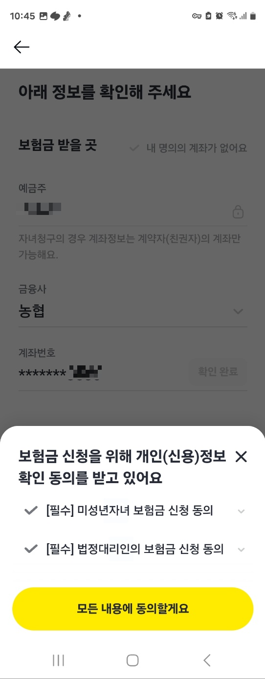 첨부 서류를 제출하면 보험금 받을 정보를 입력하면 보험금 신청이 마무리가 되고 카톡으로 보험금을 신청했다는 알림톡이 온답니다.