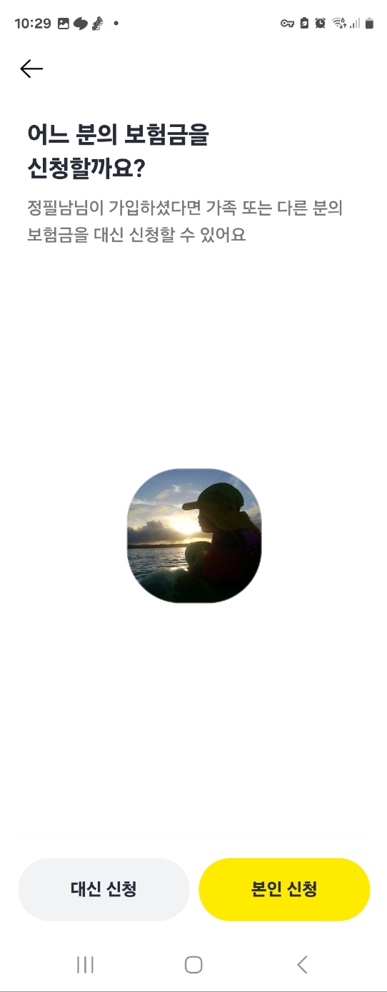 먼저 카톡 메시지에서 보험금 신청하기를 눌러줍니다. 그러면 보험금 신청에 필요한 서류를 확인할 수 있고, 서류 준비가 끝나면 보험금을 신청할게요를 눌러주세요. 그러면 어느 분의 보험금을 신청할지 물어봅니다. 제가 가족 보험을 함께 가입해서 대신 신청할 수가 있어요. 저는 딸의 보험금을 청구하는 것이므로 대신 신청을 눌러주었습니다.
