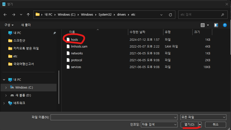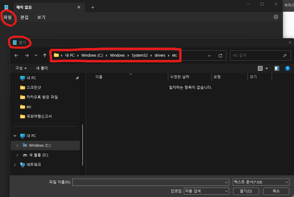 2. [파일]-[열기] 메뉴를 클릭해서 내 PC의 C: 드라이브 → Windows 폴더  → System32  → drivers  → etc 폴더 순서로 찾아 들어갑니다.
