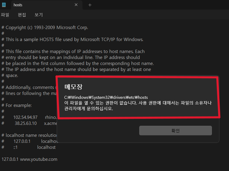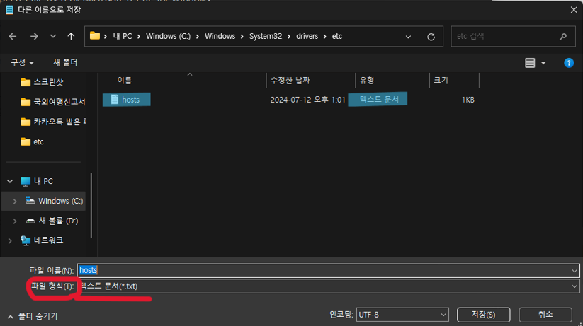 저장을 눌렀는데 바로 저장되지 않고 아래 첫 번째 사진과 같이 [다른 이름으로 저장] 창이 뜨면서 텍스트 문서로 저장이 되려 한다면  1번에서 언급한 메모장 관리자 권한으로 실행이 안된 겁니다. 여기서 파일 형식을 모든 파일로 선택해서 hosts 파일에 덮어쓰기를 하려고 해도 두 번째 사진과 같은 메시지가 뜨면서 저장이 되지 않아요. 메모장을 반드시 관리자 권한으로 열어주셔야 합니다.
