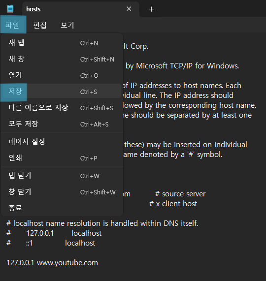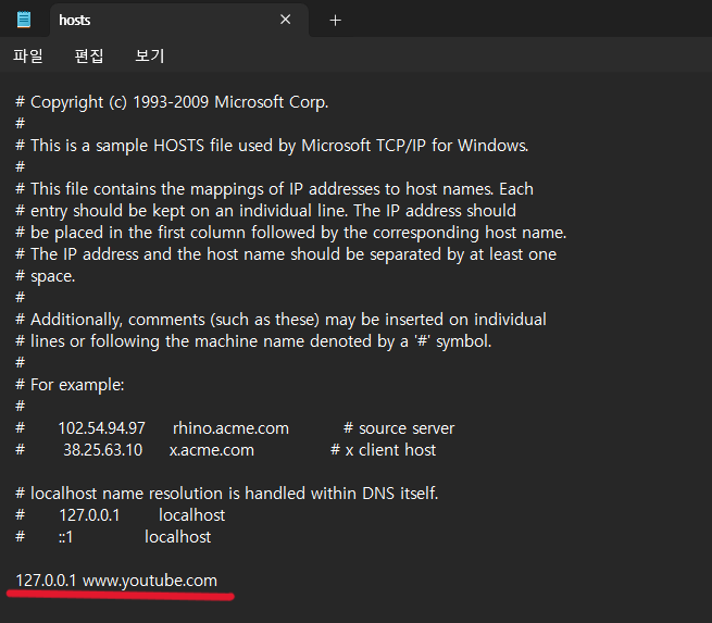 5. hosts 파일의 맨 아래에 127.0.0.1 www.youtube.com을 입력합니다.