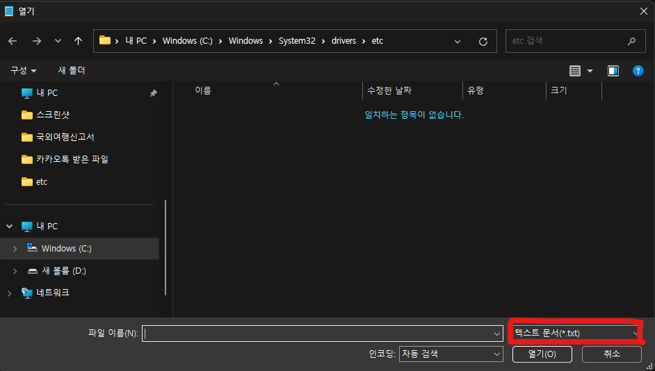 3. 아무런 파일도 안보이지요? 열기 창 오른쪽 하단에 텍스트 문서(*. txt)를 클릭해서 모든 파일(*.*)을 클릭해 줍니다.