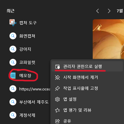 메모장 관리자 권한으로 열기