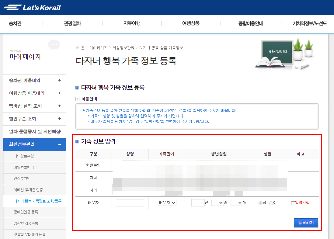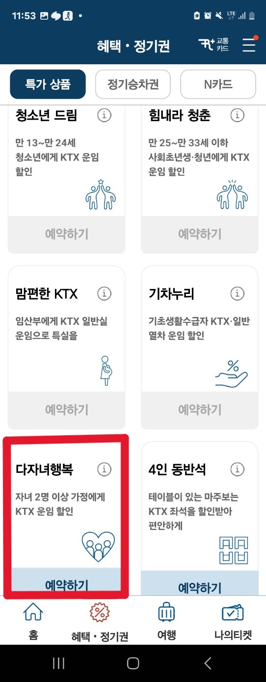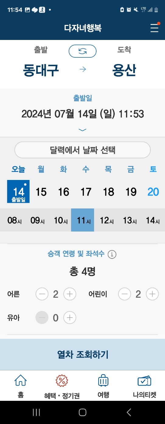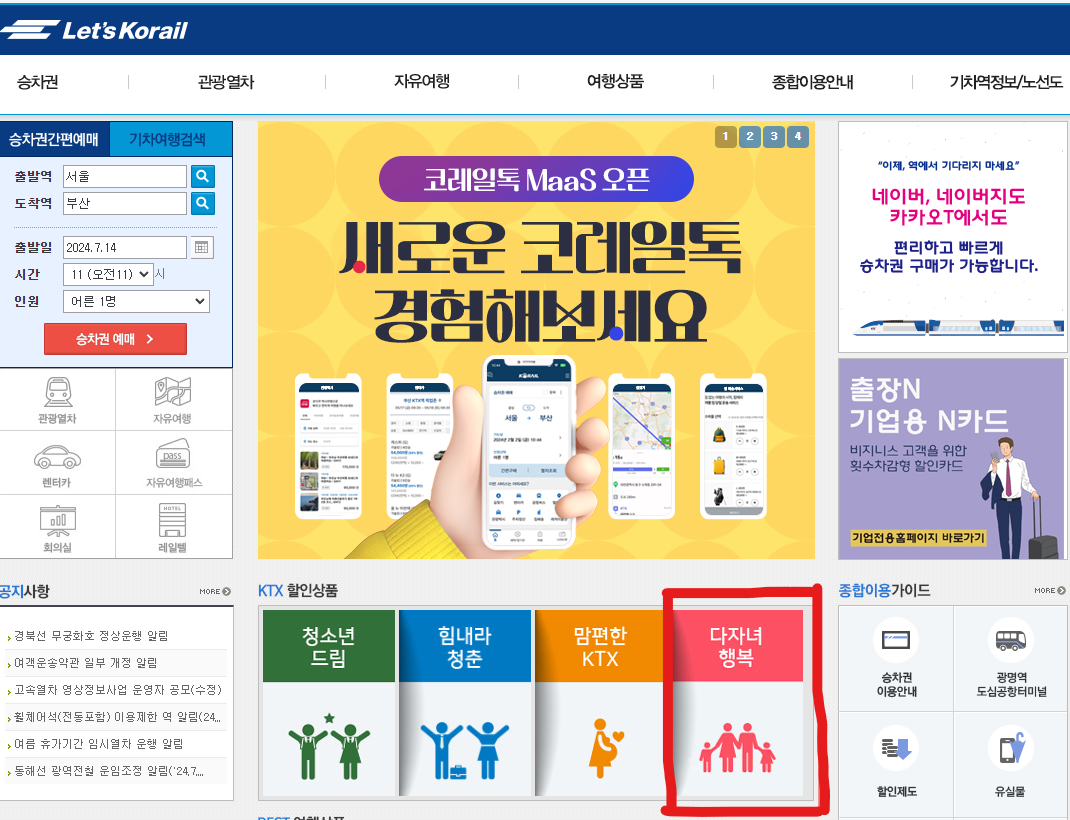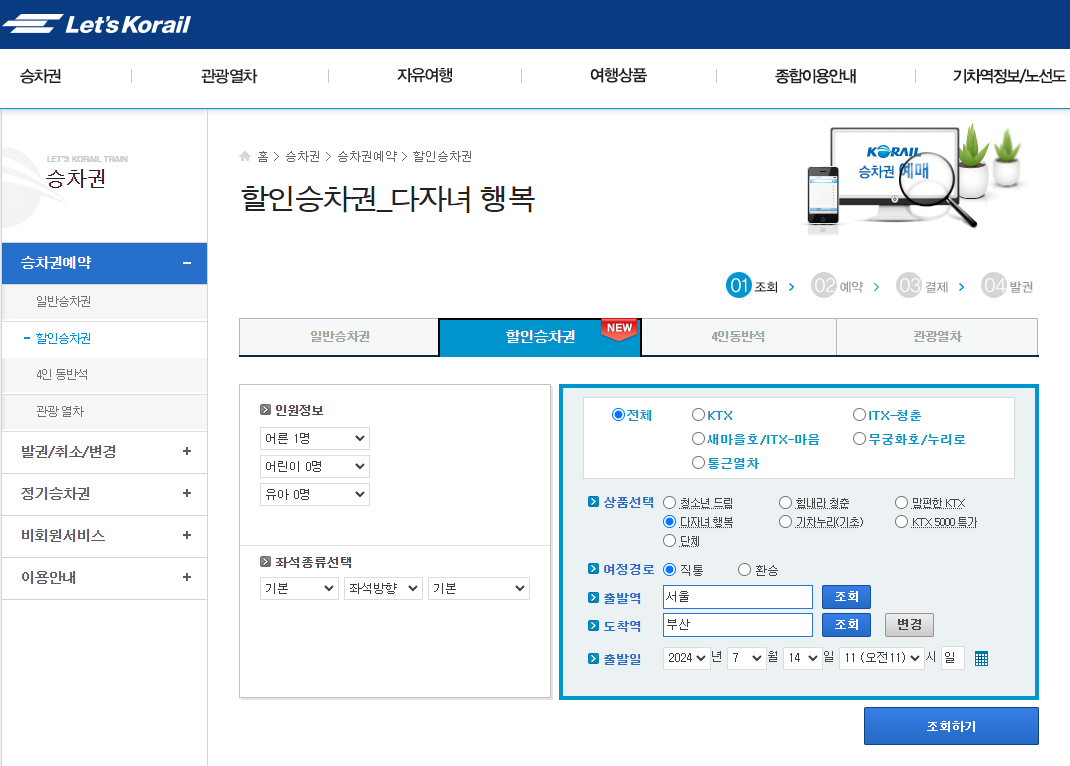 홈 화면에서 [다자녀 행복] 클릭 - 인원정보, 역정보, 날짜 등 입력 후 조회하기
