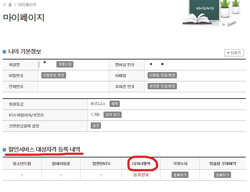 4. 할인서비스 대상자격 등록 내역에 [다자녀 행복] - [등록하기] 클릭 (저는 이미 등록을 해서 등록 완료가 뜸)